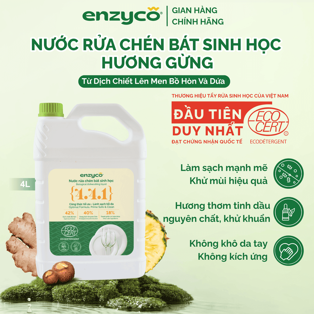 Nước Rửa Chén Sinh Học ENZYCO Từ Bồ Hòn & Dứa – Hương Gừng/Cam - Chứng Nhận ECOCERT Ecodetergent, Dịu Nhẹ Da Tay - Can 4L