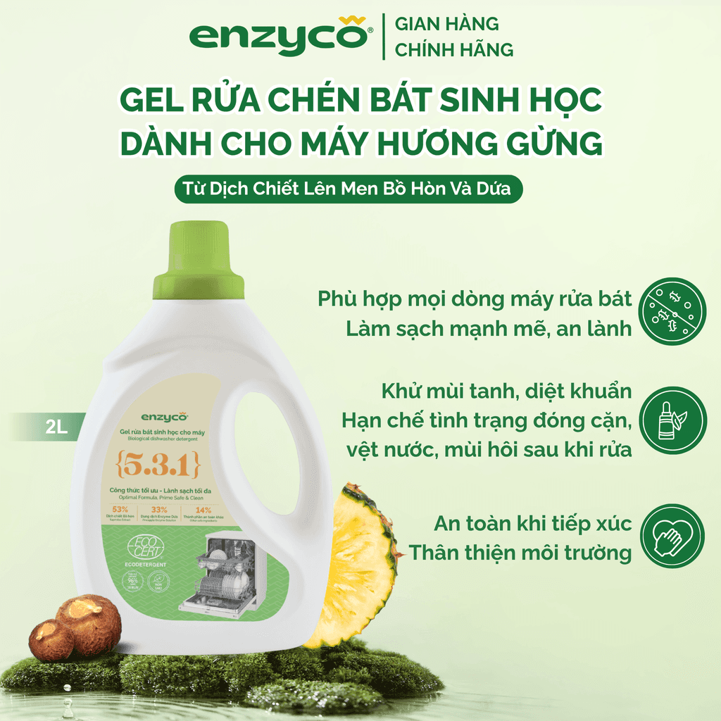 Gel Rửa Chén Cho Máy Sinh Học ENZYCO Từ Bồ Hòn & Dứa – Hương Gừng - Chứng Nhận ECOCERT Ecodetergent, Can 2L