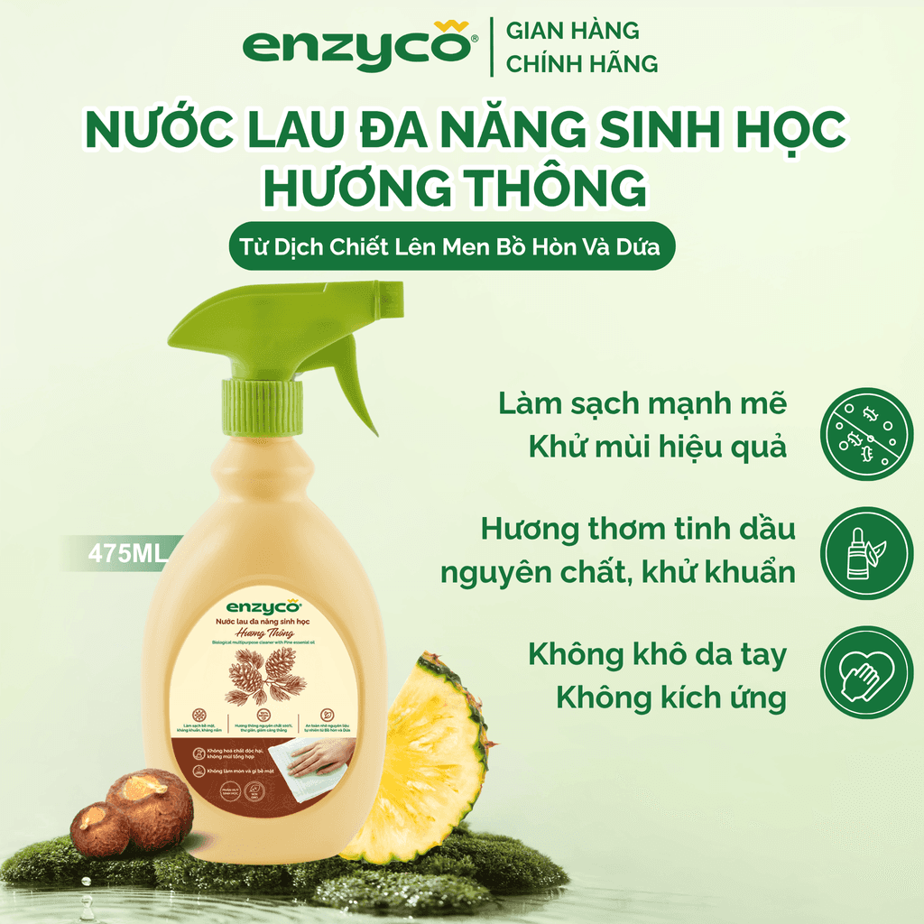 Nước Lau Đa Năng Sinh Học ENZYCO Từ Bồ Hòn & Dứa – HươngThông - Chứng Nhận ECOCERT Ecodetergent, An Toàn Da Tay Và Hít Thở - Chai 475ml