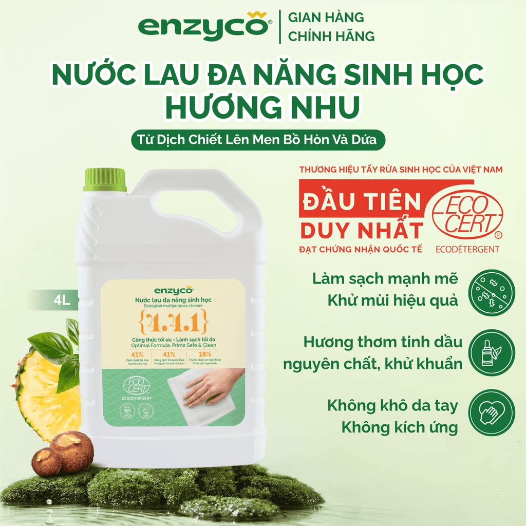 Nước Lau Đa Năng Sinh Học ENZYCO Từ Bồ Hòn & Dứa – Hương Thảo, Hương Nhu - Chứng Nhận ECOCERT Ecodetergent, An Toàn Da Tay Và Hít Thở - Can 4L