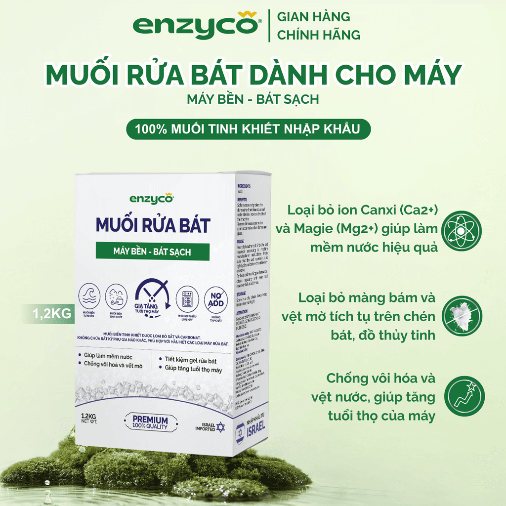 Muối Cho Máy Rửa Chén ENZYCO - Nhập Khẩu Từ Isreal Muối Biển Tự Nhiên Tinh Khiết - Làm Mềm Nước, Loại Bỏ Mảng Bám Và Vệt Mờ Hộp 1,2kg