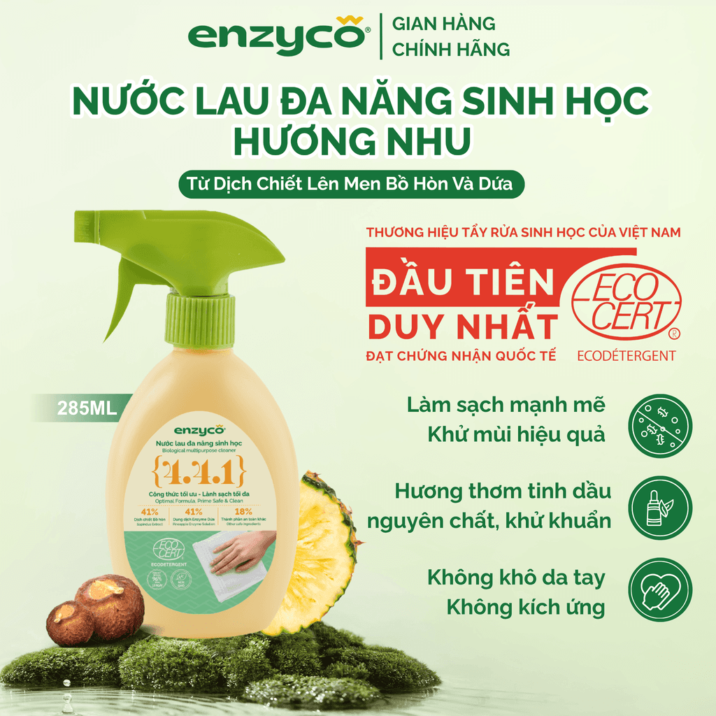 Nước Lau Đa Năng Sinh Học ENZYCO Từ Bồ Hòn & Dứa – Hương Nhu - Chứng Nhận ECOCERT Ecodetergent, An Toàn Da Tay Và Hít Thở - Chai 285ml / Chai 475ml / Can 4L