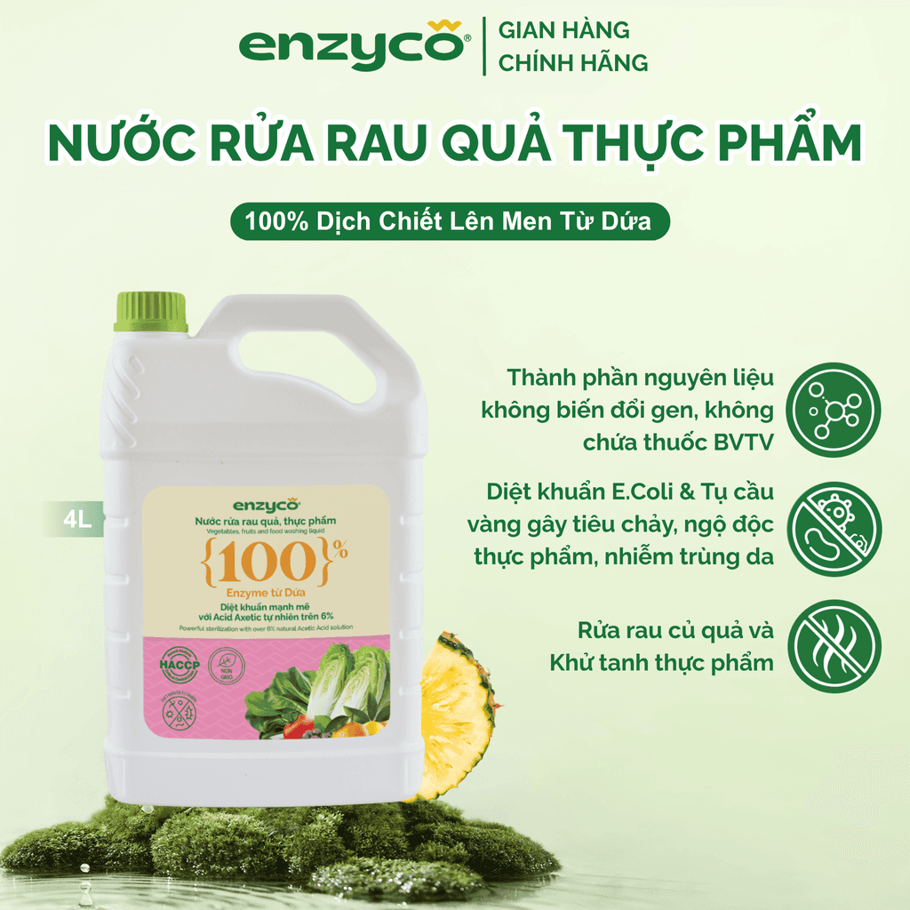 Nước Ngâm Rửa Rau Củ Thực Phẩm Sinh Học ENZYCO Từ Dịch Chiết Lên Men Dứa - Axit Axetic Hữu Cơ 6% - Diệt Khuẩn E.Coli, Tụ Cầu Vàng Gây Ngộ Độc, Tiêu Chảy - Can4L