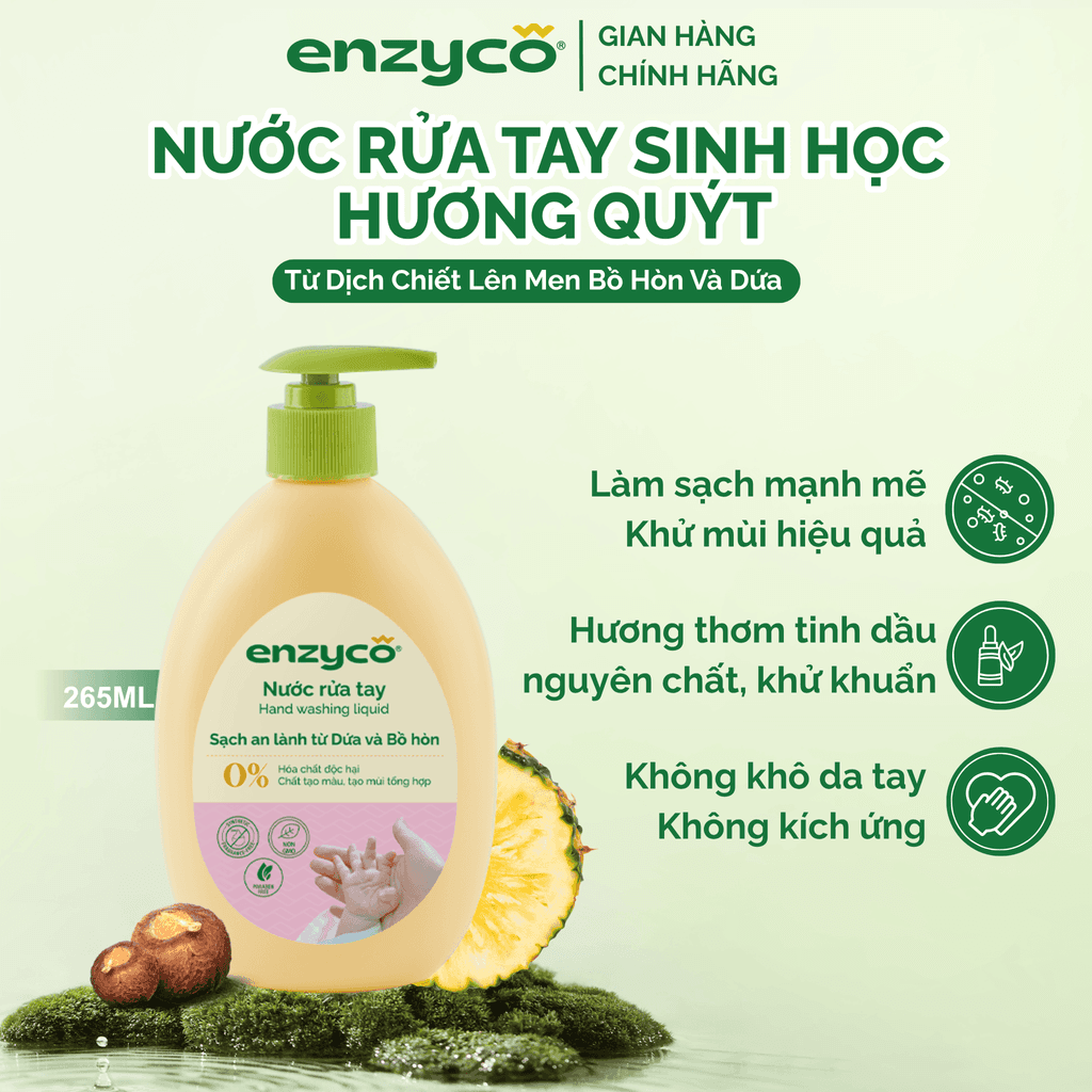 Nước Rửa Tay Sinh Học ENZYCO - Từ Dịch Chiết Lên Men Bồ Hòn Và Dứa - Hương Quýt - Diệt Khuẩn Mạnh Mẽ, An Toàn Khi Tiếp Xúc - Chai 265ml/Chai 465ml/Can 2L/Can 4L