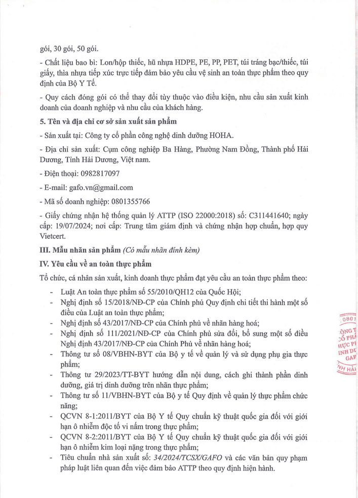 Công thức của Gafo Fucoidan kết hợp nhiều thành phần quý giá, bao gồm Fucoidan nhập khẩu từ Nhật Bản, Beta Glucan, sữa non 24h, chiết xuất Đông trùng hạ thảo, tảo xoắn Spirulina, và Aquamin F từ tảo biển đỏ Iceland, cùng hỗn hợp vitamin, khoáng chất, bột yến sào, ngũ cốc và các loại hạt, giúp cung cấp đầy đủ dưỡng chất và năng lượng cho cơ thể. Sodium Copper Chlorophyllin (chiết xuất diệp lục) cũng được bổ sung nhằm hỗ trợ thanh lọc cơ thể và tăng cường chức năng gan.