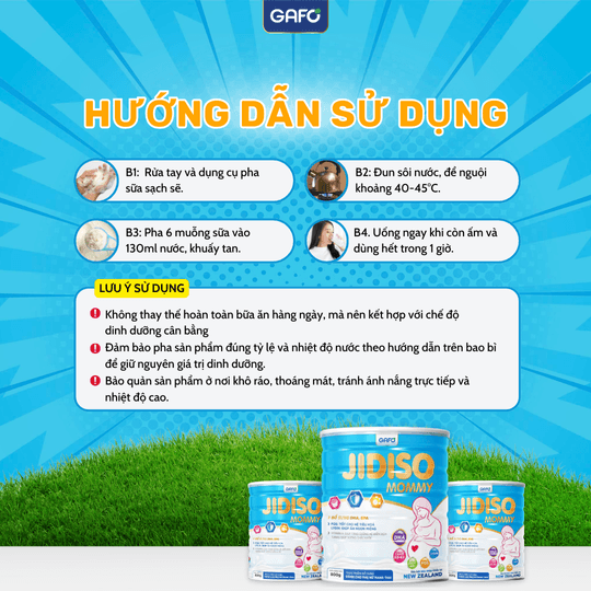 - Pha 4 muỗng gạt ngang sữa JIDISO MOMMY (khoảng 40g) với 180ml nước ấm (40-50°C), khuấy đều cho đến khi tan hoàn toàn.