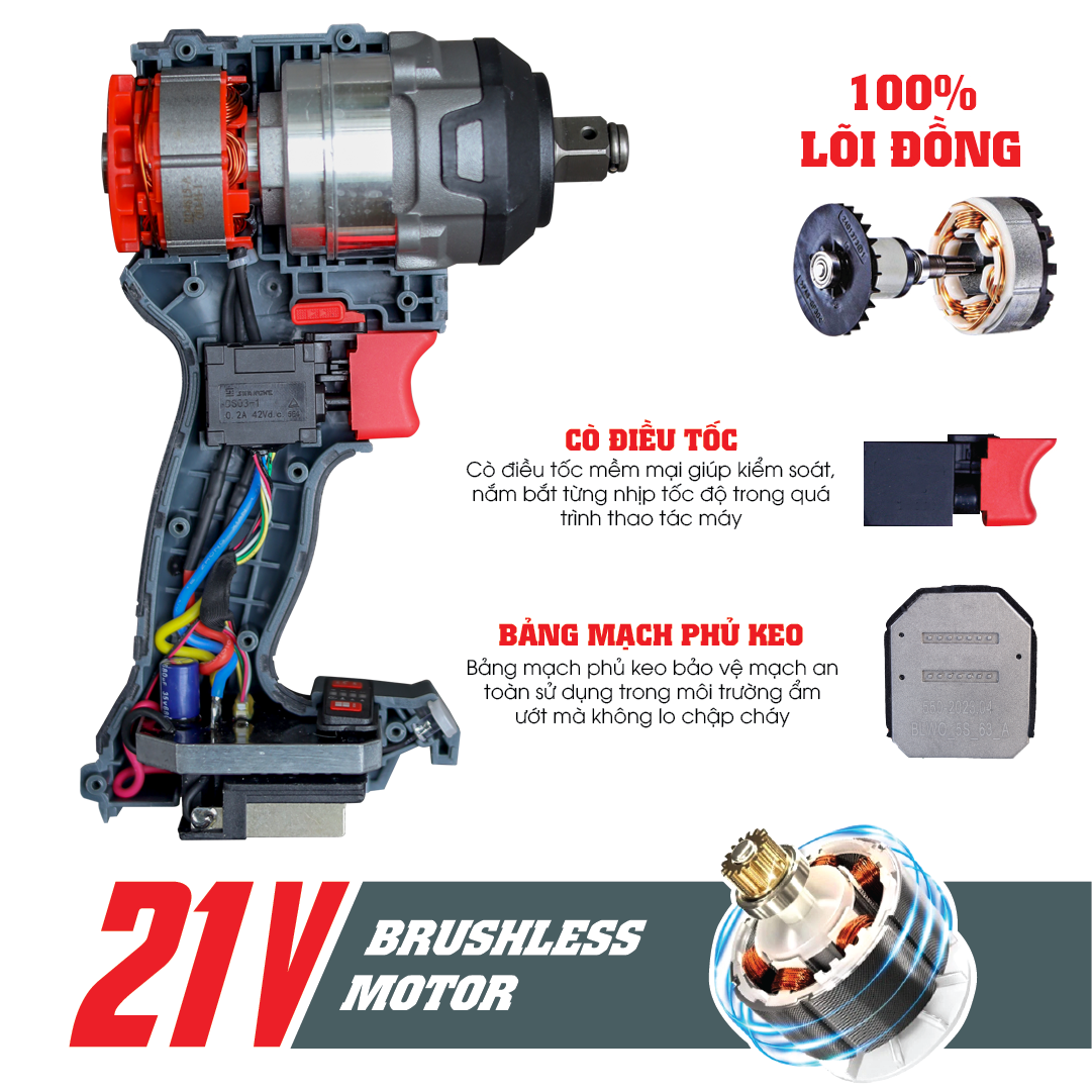 - Momen xoắn tối đa: 550NM (mở ốc nồi bánh tay ga, ốc oto 7 chổ)