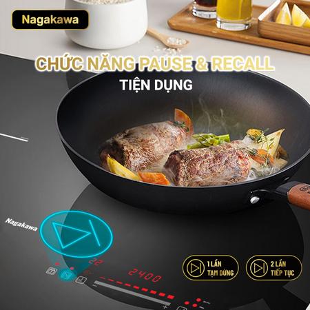 Khi bận việc đang lúc dở tay đun nấu, lúc này bạn có thể sử dụng phím Pause để tạm dừng hoạt động bếp. Khi trở lại, bạn chỉ cần ấn phím Pause một lần nữa, bếp đôi điện từ Nagakawa NAG1214M sẽ tiếp tục hoạt động bình thường với chương trình đã cài đặt trước đó.
