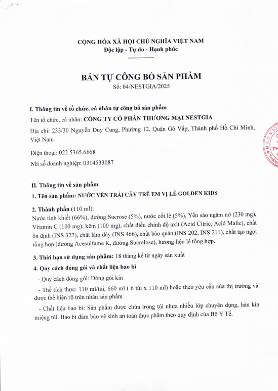 NESTGIA mang đến Nước Yến Trái Cây Vị Lê Golden Kids, sản phẩm kết hợp yến thật với nước cốt dâu tây tươi ngon, giúp bé tăng cường đề kháng và phát triển toàn diện. Trên sàn TMĐT Hi1, nhiều bà mẹ chia sẻ rằng bé nhà họ "uống như uống nước ngọt" nhờ vị Lê thơm lừng, đồng thời khen ngợi sản phẩm giúp con ít ốm vặt hơn trong mùa lạnh.