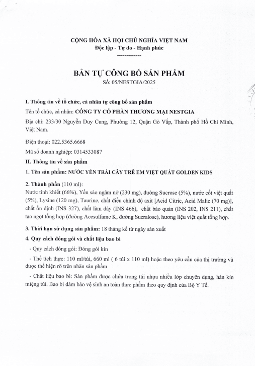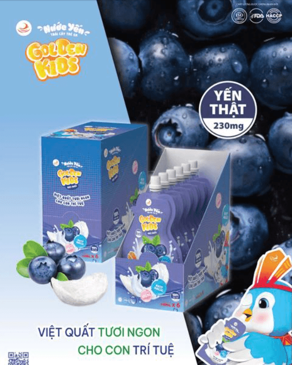 NESTGIA mang đến Nước Yến Trái Cây Vị Việt Quất Golden Kids, sản phẩm kết hợp yến thật với nước cốt dâu tây tươi ngon, giúp bé tăng cường đề kháng và phát triển toàn diện. Trên sàn TMĐT Hi1, nhiều bà mẹ chia sẻ rằng bé nhà họ "uống như uống nước ngọt" nhờ vị Việt Quất thơm lừng, đồng thời khen ngợi sản phẩm giúp con ít ốm vặt hơn trong mùa lạnh.
