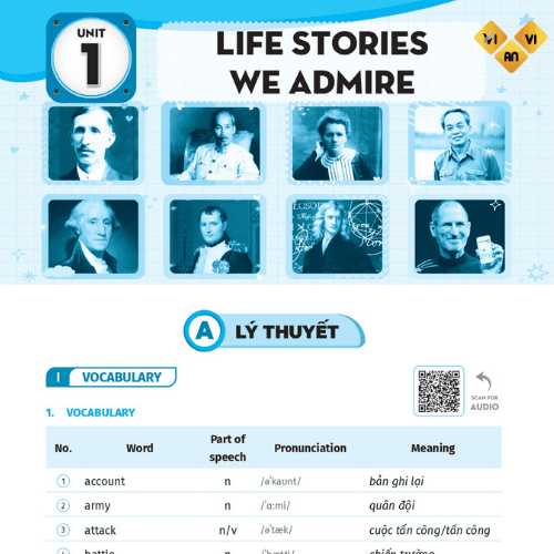Phần mềm học cùng sách bao gồm mã QR học từ vựng, luyện nghe và nói tiếng Anh theo từng đơn vị bài học.