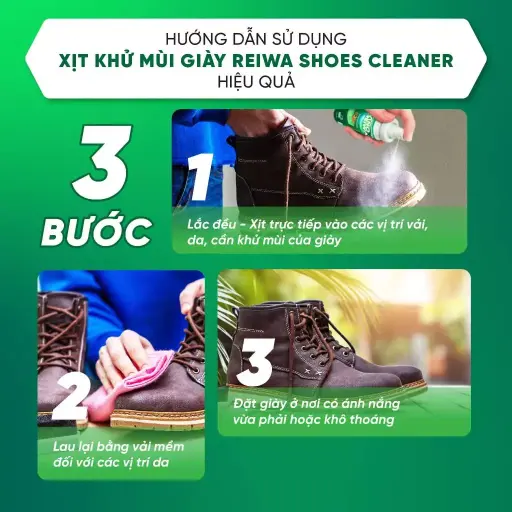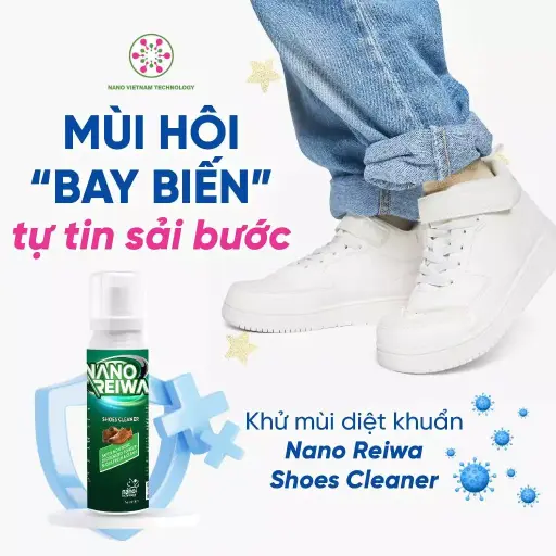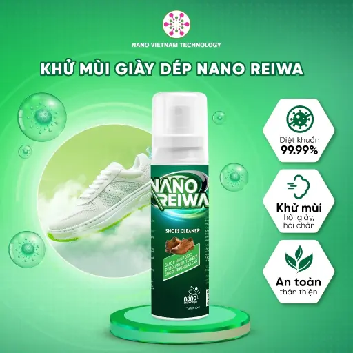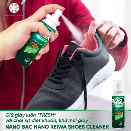 Xịt Khử Mùi Giày Dép Nano Bạc - Nano Reiwa Shoe Cleaner sử dụng nano bạc 25ppm, diệt khuẩn 99.99% theo kiểm nghiệm Viện Pasteur, khử mùi hôi giày nhanh chóng trong 3-5 phút. Không cồn, không hóa chất độc, sản phẩm an toàn cho trẻ em, bảo vệ đôi giày luôn sạch sẽ, thơm tho. Chọn Reiwa Shoe Cleaner từ Nano Việt Nam Technology để tự tin bước đi với đôi giày sạch khuẩn, không mùi hôi!