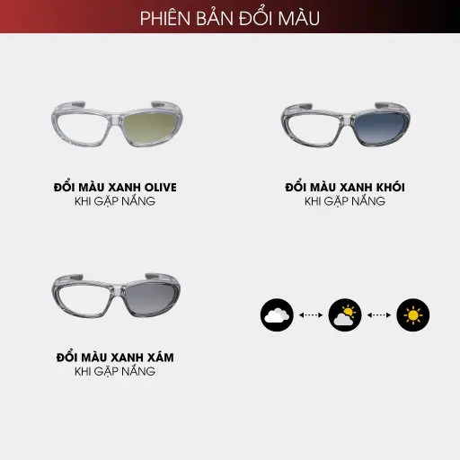 - Tự động đổi màu: Tròng kính chuyển màu thông minh từ trong suốt sang tối màu khi ra nắng, phù hợp ban ngày lẫn ban đêm.
