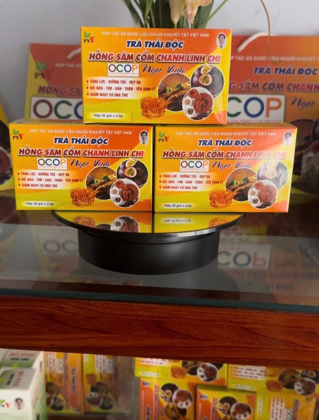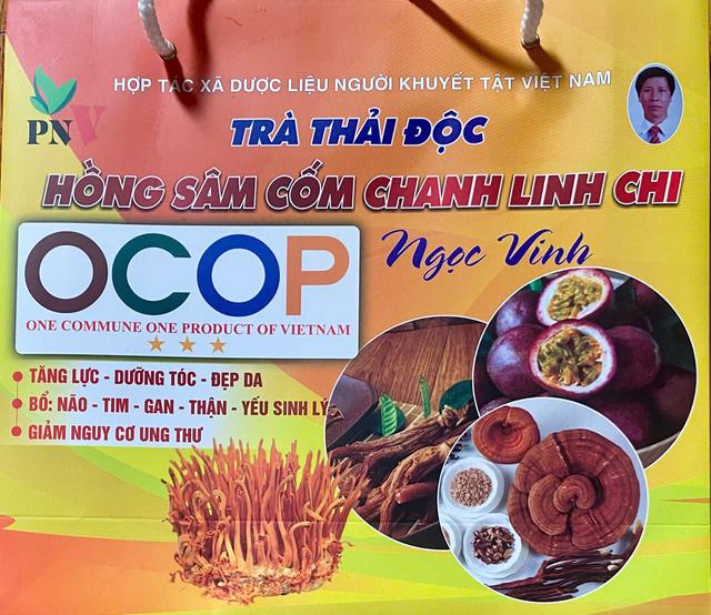 Tên sản phẩm: Trà thải độc Hồng sâm – Cốm chanh – Linh chi Ngọc Vinh (OCOP 4 sao) Quy cách: Hộp 20 gói x 2.5g (dùng được 20 ngày) Xuất xứ: Việt Nam – Hợp tác xã Dược liệu Người khuyết tật Việt Nam