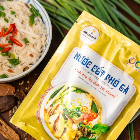 - Hương vị tự nhiên, thanh ngọt: Chiết xuất từ xương gà tươi và xương ống heo ninh lâu, kết hợp thảo mộc truyền thống như hoa hồi, thảo quả, quế, đinh hương, hành tím và nước mắm cá cơm, mang đến vị phở gà Hà Nội nhẹ nhàng, dễ ăn mà không cần nấu phức tạp.