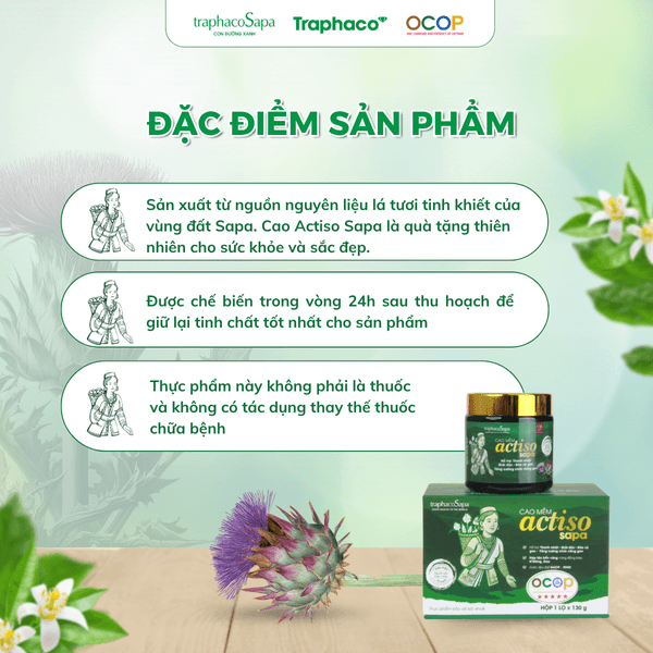 - Cao mềm Atiso Sapa TRAPHACOSAPA được bào chế từ nguồn nguyên liệu lá tươi tinh khiết của vùng đất Sapa. Cao Actiso Sapa là quà tặng thiên nhiên quý giá cho sức khỏe và sắc đẹp.