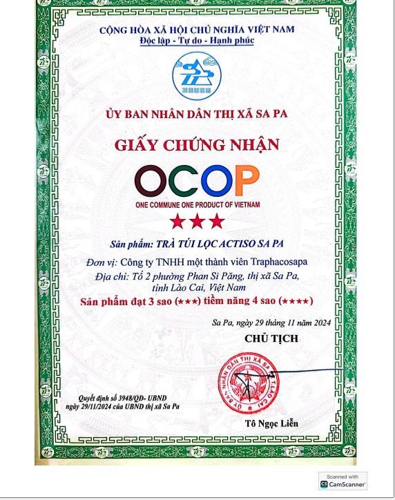 - Trà túi lọc Atiso Sapa là sản phẩm được chiết xuất từ vùng nguyên liệu Atiso Sapa đã được cấp Chứng nhận đạt chuẩn GACP - WHO.