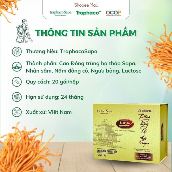 - TraphacoSapa là công ty con của công ty cổ phần Traphaco thuộc top đầu ngành dược Việt Nam, đã đạt được nhiều chứng nhận, bằng khen, là công ty có trên 20 năm hình thành và phát triển. Đây là doanh nghiệp Khoa học & công nghệ đầu tiên của tỉnh Lào Cai thực hiện thành công dự án khoa học công nghệ cấp nhà nước: ”Hoàn thiện quy trình sản xuất một số sản phẩm bảo vệ sức khỏe từ nấm ĐTHT (cordyceps militaris) tại huyện Sapa – Lào Cai”, từ chủng nấm Nhật Bản (do Elipha chuyển giao) được nuôi trồng tại sapa nơi có khí hậu trong lành, mát lạnh, độ ẩm sương giáng và tuyết trắng đã tạo nên nấm vàng ĐTHT Sapa.