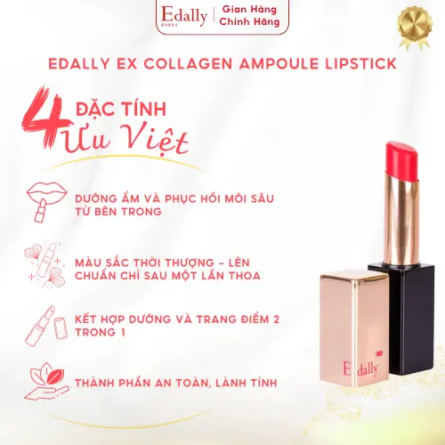 Son Môi Collagen Edally EX Collagen Ampoule Lipstick 3.5g là sản phẩm cao cấp từ Hàn Quốc, kết hợp công nghệ dưỡng môi tiên tiến với màu sắc rực rỡ, giúp môi mịn màng, căng mọng mà không chứa chì hay chất bảo quản. Với công thức dạng ampoule giàu collagen, son không chỉ mang lại lớp makeup lâu trôi mà còn dưỡng ẩm sâu, làm mờ nếp nhăn và bảo vệ môi khỏi tia UV.