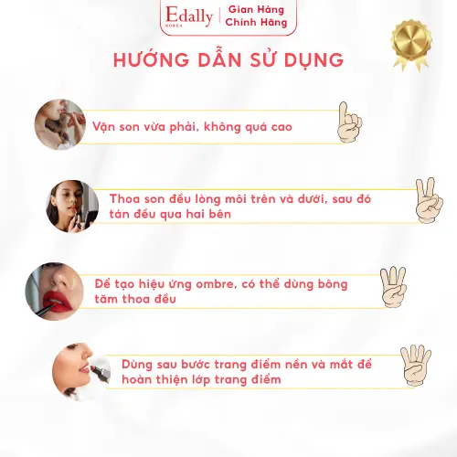 Lưu ý: Tránh thoa quá dày để giữ lớp son tự nhiên. Nếu môi khô, nên dưỡng ẩm trước khi thoa.