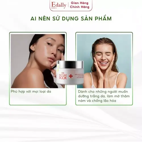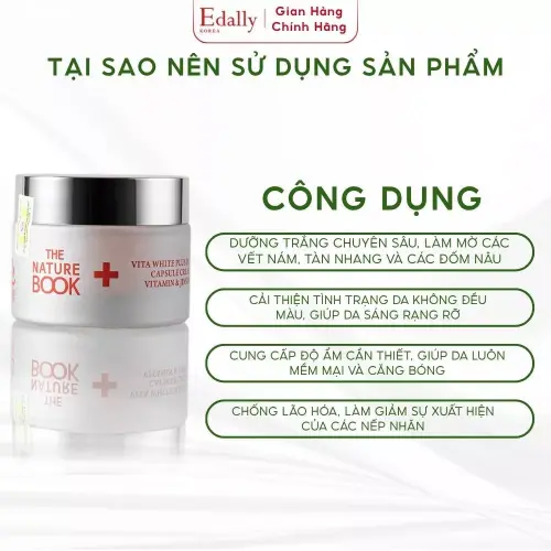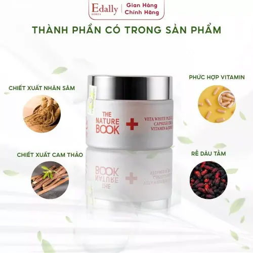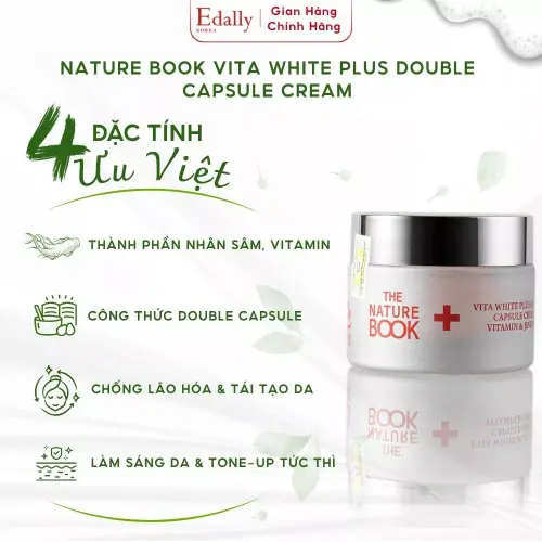 Nature Book Vita White nổi bật với công thức viên nang kép (Double Capsule) độc quyền, giúp dưỡng chất được bảo vệ tối ưu và giải phóng dần dần vào da – khác biệt so với các kem dưỡng thông thường chỉ thấm bề mặt. Sản phẩm kết hợp nhân sâm Hàn Quốc với phức hợp vitamin và Hyaluronic Acid, tập trung vào dưỡng trắng sâu từ bên trong mà không làm da trắng ảo hay mỏng manh.