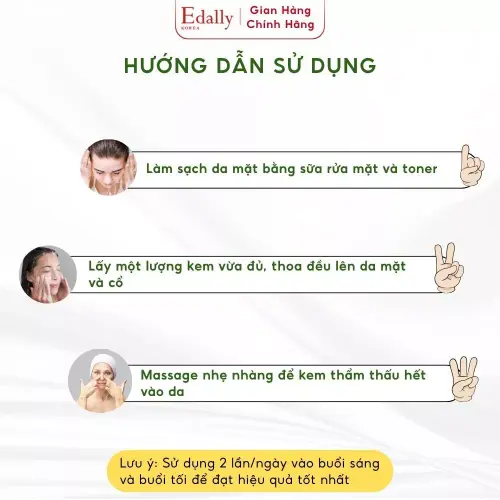 - Lưu ý: Sử dụng 2 lần/ngày (buổi sáng và tối) để đạt hiệu quả tốt nhất. Kết hợp với kem chống nắng ban ngày để bảo vệ da. Tránh tiếp xúc trực tiếp với mắt.