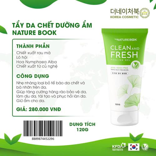 Tẩy da chết dưỡng ẩm Nature Book (Clean and Fresh Peeling Gel) là giải pháp làm sạch sâu dịu nhẹ từ Hàn Quốc. Sản phẩm được thiết kế với công thức chứa bộ ba AHA, BHA, và PHA giúp loại bỏ lớp sừng già cỗi một cách hiệu quả mà vẫn duy trì được độ ẩm mượt, không gây kích ứng cho da.