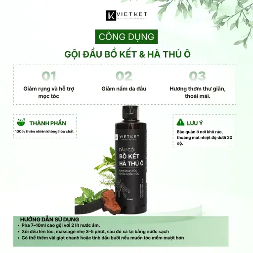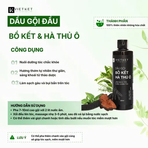 Nếu bạn đang tìm một dầu gội thảo dược an toàn, lành tính cho da đầu, Dầu gội Bồ Kết Hà Thủ Ô VIETKET 250ml là lựa chọn lý tưởng. Tinh túy từ bồ kết, hà thủ ô và thảo mộc Việt giúp làm sạch gàu, giảm rụng tóc, nuôi dưỡng tóc chắc khỏe, mang lại mái tóc mềm mượt và khỏe tự nhiên mỗi ngày.