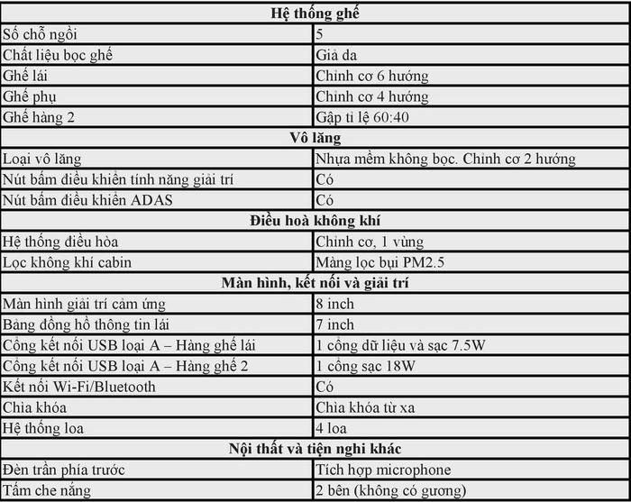 Một số thông số kỹ thuật, tiện nghi nội thất của VF5: