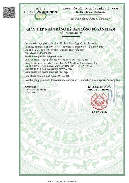 Bi-Nutafit là một sản phẩm bổ sung dinh dưỡng đến từ Canada. Sản phẩm này được sản xuất trên dây chuyền công nghệ hiện đại, đảm bảo các tiêu chuẩn nghiêm ngặt về chất lượng và an toàn. Sản phẩm đã được đăng ký bản quyền về thương hiệu giữa các nhà khoa học của hãng Zurich Pharma Inc. O/A Medicap Laboratories Inc, Canada và nhà phân phối BNC Medipharm. Bi-Nutafit đã được Bộ Y Tế cấp phép cho Công Ty TNHH TM DV Y Tế Bình Nghĩa nhập khẩu và phân phối độc quyền tại Việt Nam.