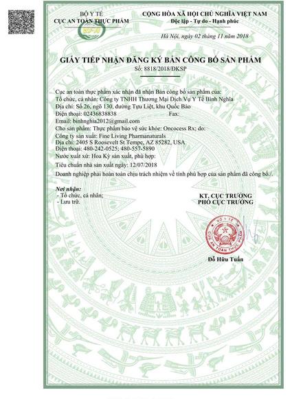 Oncocess Rx đã được đăng ký bản quyền về thương hiệu giữa các nhà khoa học của hãng Veda Biologics LLc, nhà sản suất Fine Living Pharmanaturals và nhà phân phối BNC Medipharm. Oncocess Rx đã được Bộ Y Tế cấp phép cho Công Ty TNHH TM DV Y Tế Bình Nghĩa nhập khẩu và phân phối độc quyền tại Việt Nam.