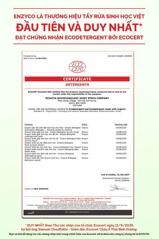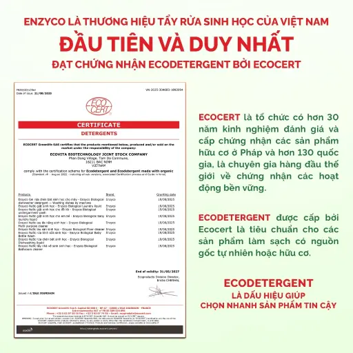 Ước mơ ấy được chắp cánh khi, Enzyco đạt được chứng nhận Ecodetergent bởi ECOCERT - tiêu chuẩn khắt khe nhất cho sản phẩm tẩy rửa sinh học.