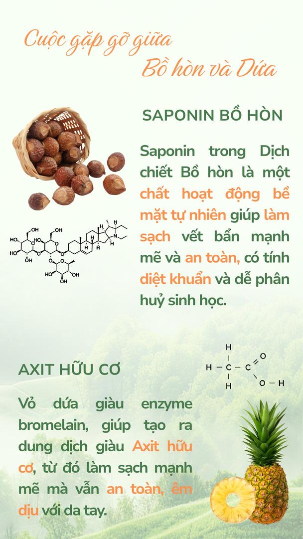 - Nước giặt sinh học: Dịch chiết len men từ Bồ hòn và Dứa, Decyl Glucoside, Sodium C14-16 Olefin Sulfonate, Sodium Methyl 2-Sulfolaurate và Disodium 2- Sulfolaurate, Glycerin, Sodium benzoate và Potassium sorbate, sodium Bicarbonate, Xanthan Gum, tinh dầu Bạc Hà