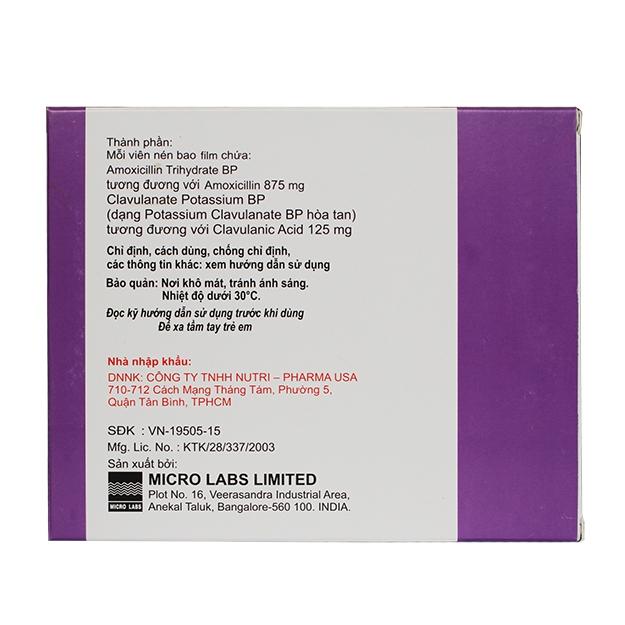 Amoxicillin Trihydrat BP tương đương Amoxicillin 875 mg: Kháng sinh phổ rộng, ức chế sự phát triển và tiêu diệt vi khuẩn gây bệnh.