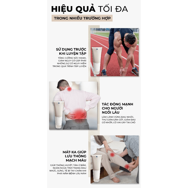 - Hỗ trợ giảm các chấn thương như bong gân, chuột rút, mỏi lưng, đau lưng, chân tay bị tê.
