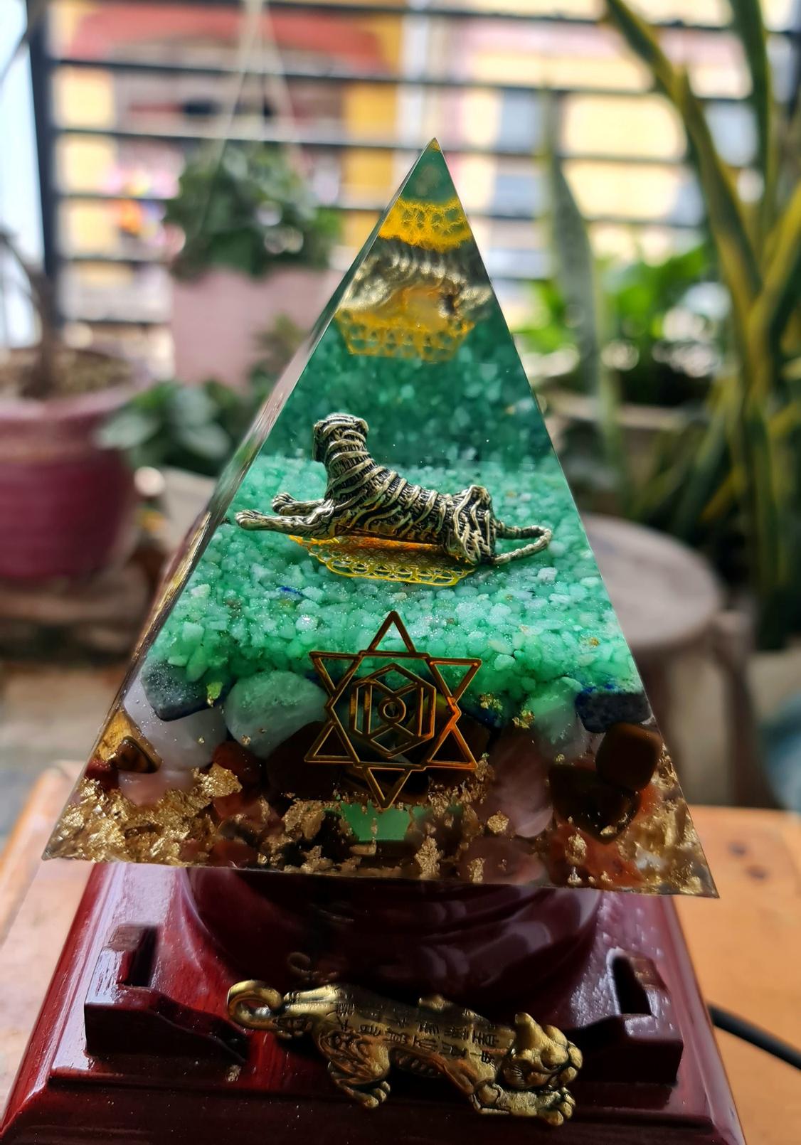 Kim tự tháp được chế tác từ 5 loại đá thạch anh tự nhiên kết hợp với tượng đồng tuổi Dần, mỗi loại đá đại diện cho một hành trong ngũ hành, giúp bổ sung năng lượng phù hợp: