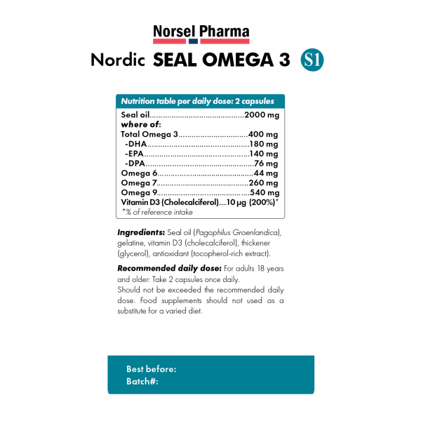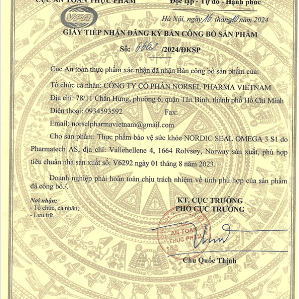 - Nordic Seal Omega 3 S1 (Vi chất Omega 3 Hải Cẩu Bắc Âu dòng S1) là vi chất bảo vệ sức khoẻ được phát triển và sản xuất tại Na Uy, theo tiêu chuẩn Na Uy, được chứng nhận từ Châu Âu và Hoa Kỳ