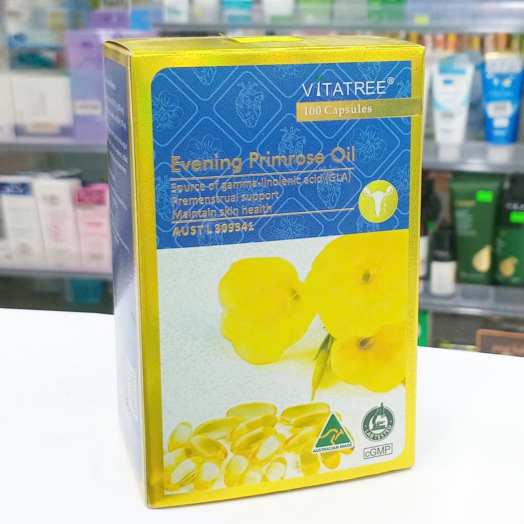 Vitatree Evening Primrose Oil 1000mg (lọ 120 viên) là thực phẩm chức năng sản xuất tại Úc bởi thương hiệu nổi tiếng Vitatree Australia, chiết xuất từ dầu hoa anh thảo nguyên chất giúp hỗ trợ cân bằng nội tiết tố nữ, cải thiện làn da, giảm mụn nội tiết, hỗ trợ giảm triệu chứng tiền mãn kinh và điều hòa kinh nguyệt.