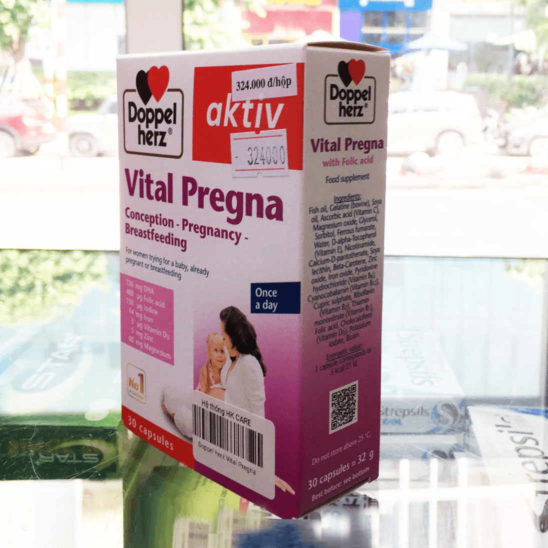 Viên uống bổ sung Doppel Herz Vital Pregna, xuất xứ Đức, sản xuất bởi Queisser Pharma GmbH & Co. KG, hỗ trợ bổ sung vitamin, khoáng chất thiết yếu như acid folic, sắt, DHA, tăng cường sức khỏe mẹ bầu, hỗ trợ phát triển não bộ và thị lực thai nhi, đồng thời giảm nguy cơ thiếu hụt dinh dưỡng trong thai kỳ và cho con bú.