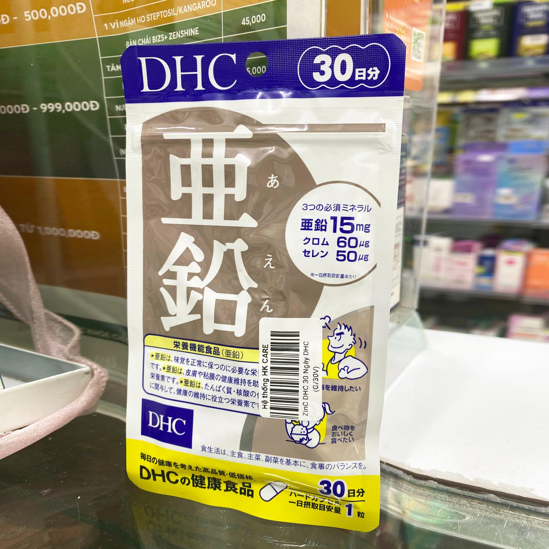 Viên uống bổ sung kẽm DHC Zinc, xuất xứ Nhật Bản, sản xuất bởi DHC Corporation, hỗ trợ tăng cường hệ miễn dịch, cải thiện sức khỏe da, giảm mụn, hỗ trợ quá trình trao đổi chất, đồng thời giúp tóc và móng chắc khỏe, phù hợp cho người lớn và người cần bổ sung kẽm hàng ngày.
