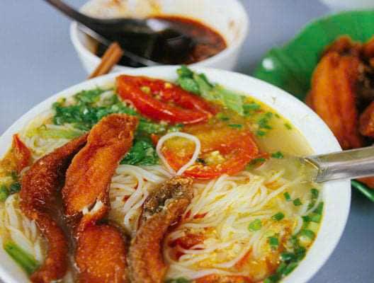 Bún được làm từ gạo bao thai hồng, kết hợp gói cá rô đồng rim, xương cá rô đồng hầm hành tím, dầu điều tạo lên màu sắc và hương vị.