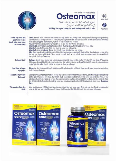 Sản phẩm Osteomax Care là sản phẩm viên nhai có chứa canxi và collagen không đường, có khả năng phát triển hệ xương chắc khỏe, bổ sung lượng collagen cần thiết cho xương, duy trì sức khỏe của hệ cơ xương. Viên nhai Osteomax Care có xuất xứ từ Châu Âu và hiện đang được công ty cổ phần GTPharma phân phối độc quyền tại Việt Nam.