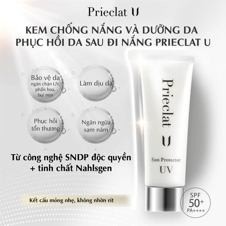 Kem chống nắng cao cấp Prieclat U chống nắng tối ưu với chỉ số SPF50+ PA++++ giúp bảo vệ da hiệu quả dưới tia UV, chống cháy nắng, ngừa nám, tàn nhang, nếp nhăn. Đặc biệt, sản phẩm chứa đa dạng các chất dưỡng ẩm tự nhiên và chiết xuất thực vật giúp dưỡng ẩm, nuôi dưỡng, phục hồi làn da khoẻ mạnh giúp da luôn mịn màng, ngăn ngừa tình trạng bong tróc, khô ráp. Thấm nhanh trên da nhờ kết cấu mỏng nhẹ, ẩm mượt, cảm giác khô thoáng trên da suốt cả ngày dài.