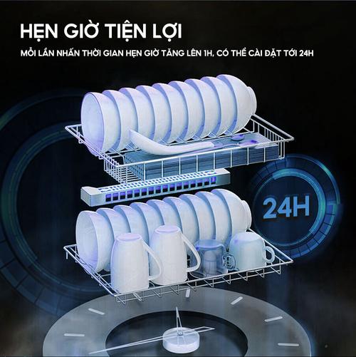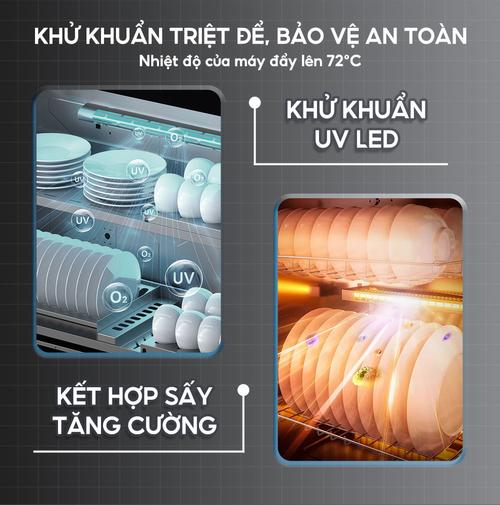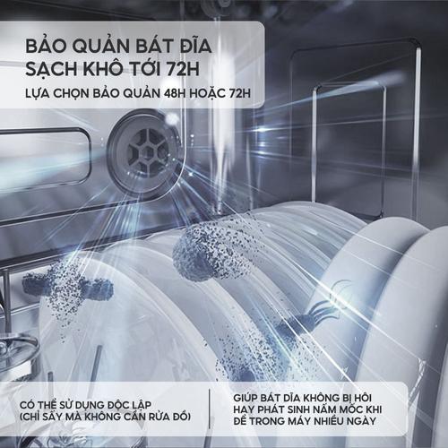 Tính năng sấy hoạt động theo cơ chế thông minh, luồng khí tươi được hút và lọc qua màng lọc khí gia nhiệt đạt mức nóng tối ưu, đồng thời tách nhỏ luồng khí, phân bổ đều 360 độ, giúp khí nóng tươi len lỏi tới mọi ngóc ngách để làm khô nhanh chóng, bảo vệ bát đĩa lên đến 72 giờ