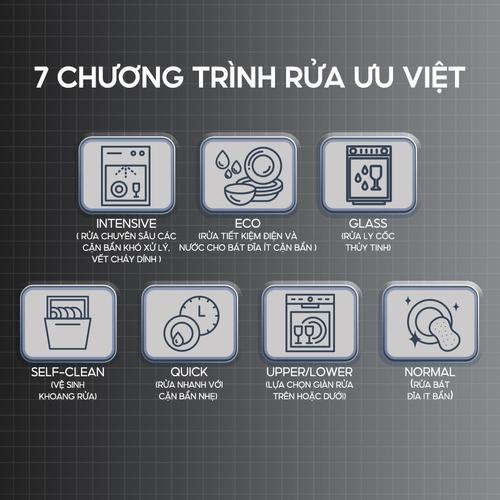 Số chương trình rửa: | 06 (Intensive, Sanitize, ECO, Rapid, Auto, Glass) +2 |