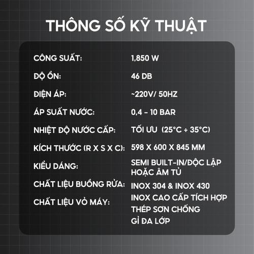 Chất liệu buồng rửa bằng Inox 304 x Inox 430 cao cấp, chất liệu vỏ máy bằng thép sơn chống gỉ đa lớp giúp sản phẩm bền đẹp, tuổi thọ cao.