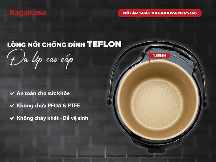 Lòng nồi được phủ lớp chống dính Teflon đa lớp cao cấp, an toàn cho sức khỏe, không chứa PFOA & PTFE – những chất có thể gây hại cho sức khỏe. Lớp chống dính này giúp thức ăn không bị cháy khét, dễ dàng vệ sinh và đảm bảo an toàn cho sức khỏe gia đình bạn.