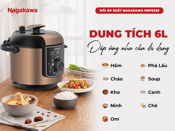 Với dung tích 6 lít, nồi áp suất điện Nagakawa NEP5366 cho phép bạn nấu lượng lớn thức ăn, đáp ứng nhu cầu của cả gia đình, kể cả trong những dịp sum họp, liên hoan. Bạn có thể thoải mái chế biến các món ăn yêu thích từ hầm, ninh, kho đến nấu cơm, nấu cháo,hấp thức ăn,... đa dạng và tiện lợi.