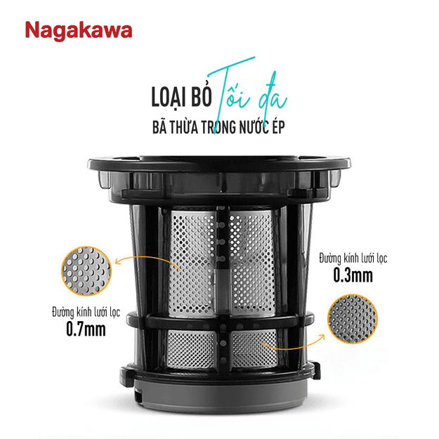 Bã thực phẩm, chất xơ siêu nhỏ sẽ bị giữ lại nhờ bộ lọc bã với các lưới lọc nhỏ li ti 0,3mm. Cho chất lượng nước ép sánh mịn, thơm ngon và không tách nước, sẽ không còn cảm giác bột đọng trong miệng khi thưởng thức.