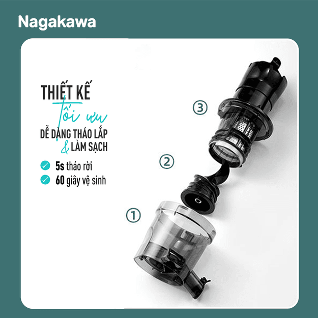 Tháo lắp và vệ sinh là mối quan tâm lớn nhất của người tiêu dùng khi sử dụng máy ép chậm. Tháo tháo lắp quá khó khăn và thiết kế phức tạp gây ảnh hưởng lớn đến trải nghiệm người dùng và tiêu tốn nhiều thời gian. Vì vậy máy ép chậm NAG0818 được thiết kế tối giản và tiện lợi hơn. Chỉ cần 5 giây để tháo rời và 60 giây để vệ sinh.